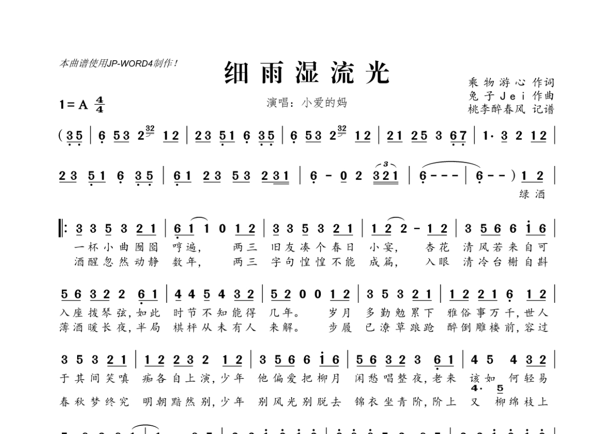 《细雨湿流光》是小爱的妈演唱的一首歌曲,拍号为4/4拍,这份简谱共有一张高清图谱,图谱由 @桃李醉春风 编配上传。