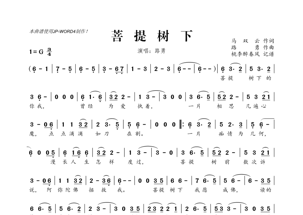 《菩提树下》是路勇演唱的一首歌曲,拍号为3/4拍,这份简谱共有一张高清图谱,图谱由 @桃李醉春风 编配上传。