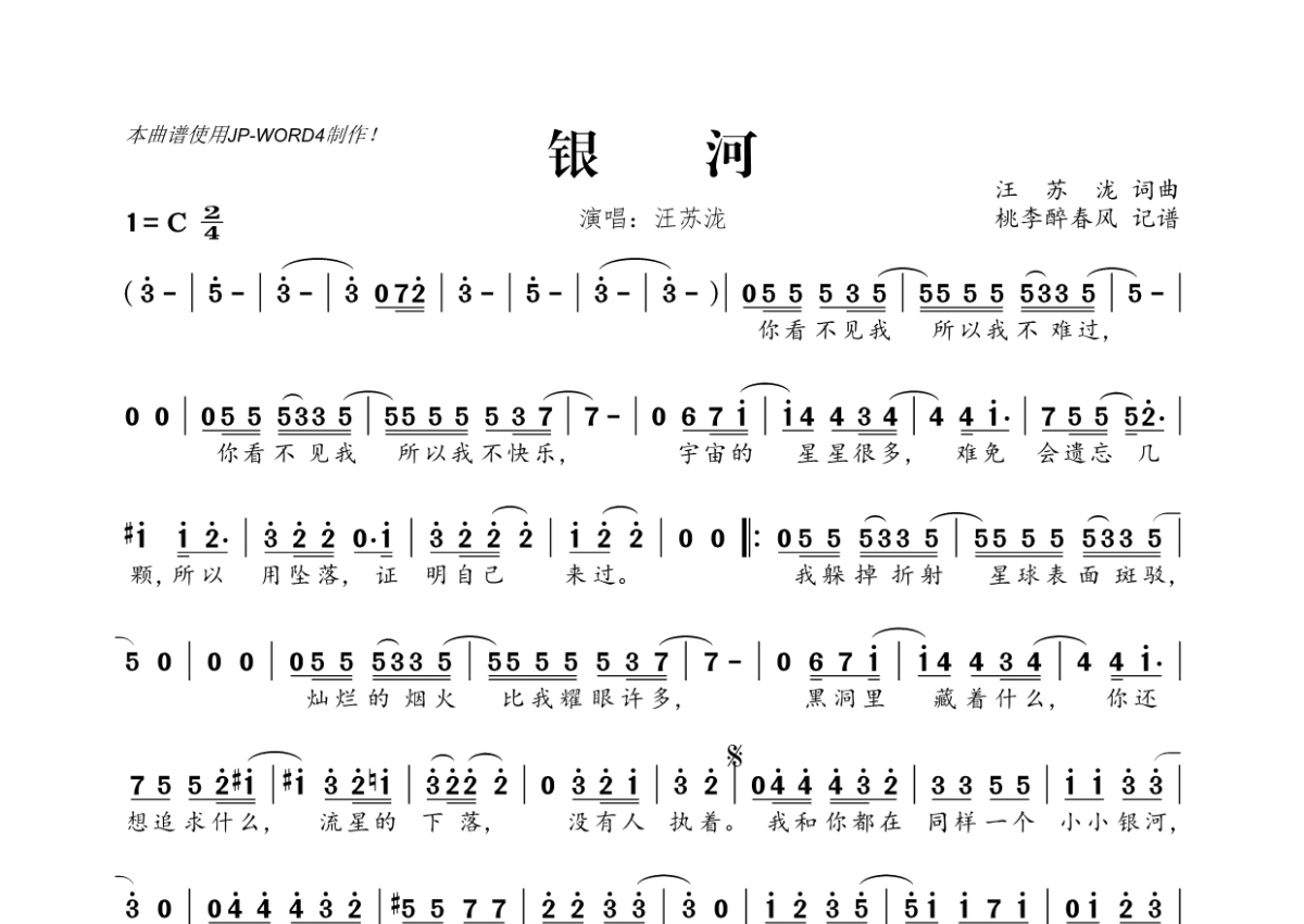 《银河》是汪苏泷演唱的一首歌曲,拍号为2/4拍,这份简谱共有一张高清图谱,图谱由 @桃李醉春风 编配上传。