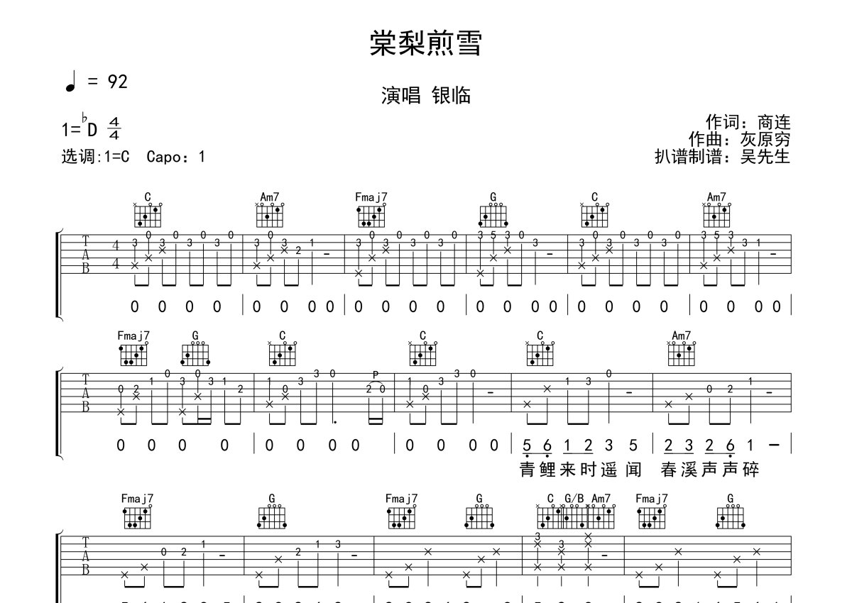 《棠梨煎雪》是银临演唱的一首歌曲,本吉他谱采用的是C调指法编配,这份吉他谱共有两张高清图谱,图谱由 @吴先生TAB 编配上传,图谱使用六线谱编配,包含吉他和弦指法、简谱以及歌词部分,使用这份棠梨煎雪吉他谱,可以让你更加方便地掌握这首歌曲的弹唱技巧,快来尝试吧。一首曲风悠然意境缠绵的原创古风歌曲,原调bD,CAPO夹一品,一首好歌,会让你百听不厌,《棠梨煎雪》带你领略那细细的美好,那美好如棠梨煎雪,幽香微凉,就像那美好的友情“一生心事一人来解”。