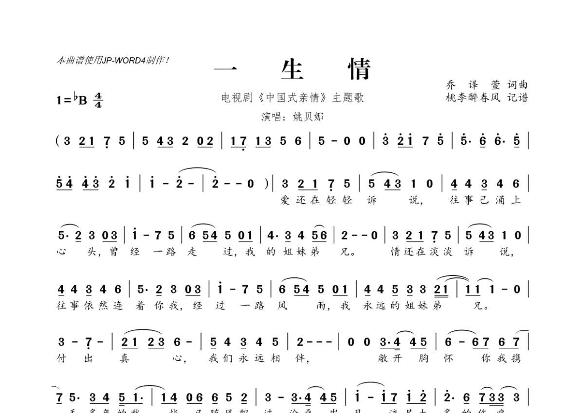 《一生情》是姚贝娜演唱的一首歌曲,拍号为4/4拍,这份简谱共有一张高清图谱,图谱由 @桃李醉春风 编配上传。