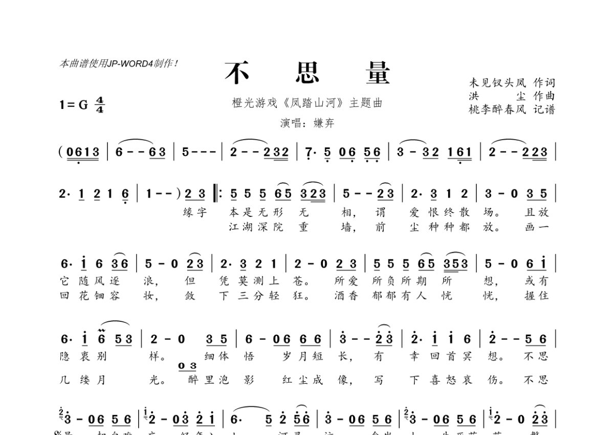 《不思量》是嫌弃演唱的一首歌曲,拍号为4/4拍,这份简谱共有一张高清图谱,图谱由 @桃李醉春风 编配上传。