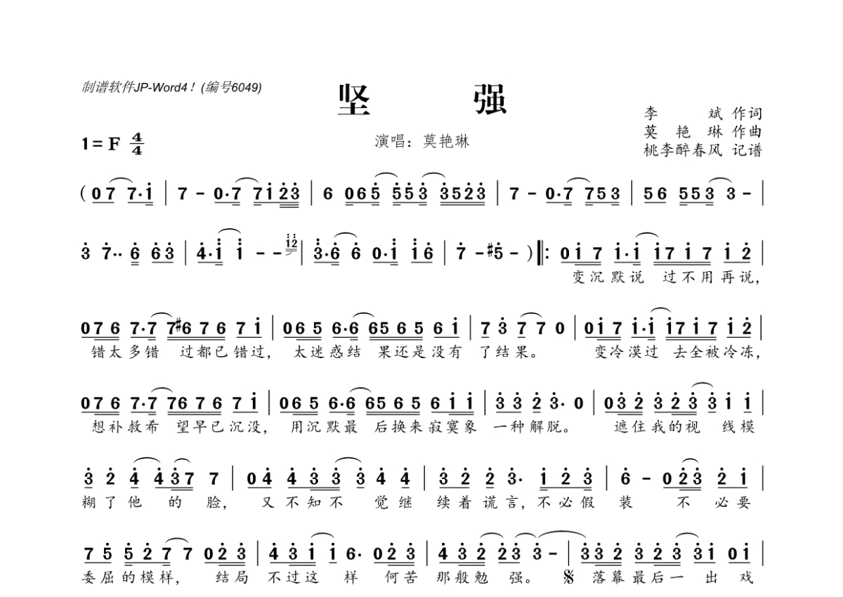 《坚强》是莫艳琳演唱的一首歌曲,拍号为4/4拍,这份简谱共有一张高清图谱,图谱由 @桃李醉春风 编配上传。
