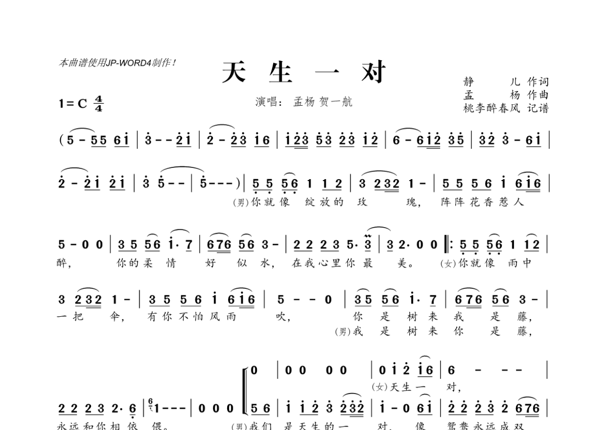 《天生一对》是孟杨&贺一航演唱的一首歌曲,拍号为4/4拍,这份简谱共有两张高清图谱,图谱由 @桃李醉春风 编配上传。