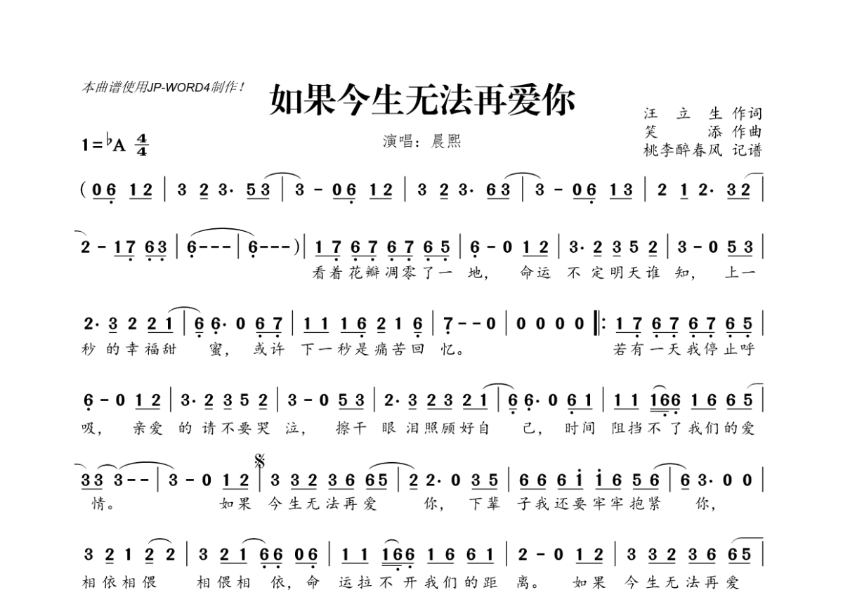 《如果今生无法再爱你》是晨熙演唱的一首歌曲,拍号为4/4拍,这份简谱共有一张高清图谱,图谱由 @桃李醉春风 编配上传。