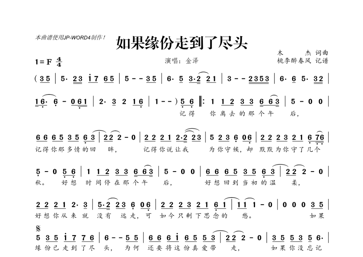 金泽《如果缘份走到了尽头》简谱