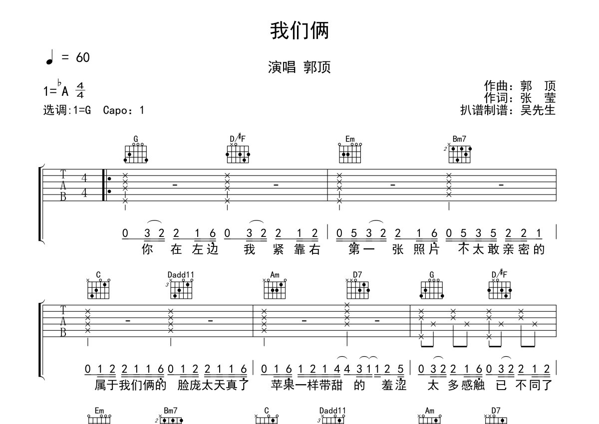 《我们俩》是郭顶演唱的一首歌曲,本吉他谱采用的是G调指法编配,这份吉他谱共有两张高清图谱,图谱由 @吴先生TAB 编配上传,图谱使用六线谱编配,包含吉他和弦指法、简谱以及歌词部分,使用这份我们俩吉他谱,可以让你更加方便地掌握这首歌曲的弹唱技巧,快来尝试吧。原调bA,Capo夹一品。一首哀而不伤的R&B歌曲,咏唱出记忆中柔软角落里曾经的美好,那些青涩的爱情和简单的我你,在歌声中让每一个人内心思绪产生共鸣。