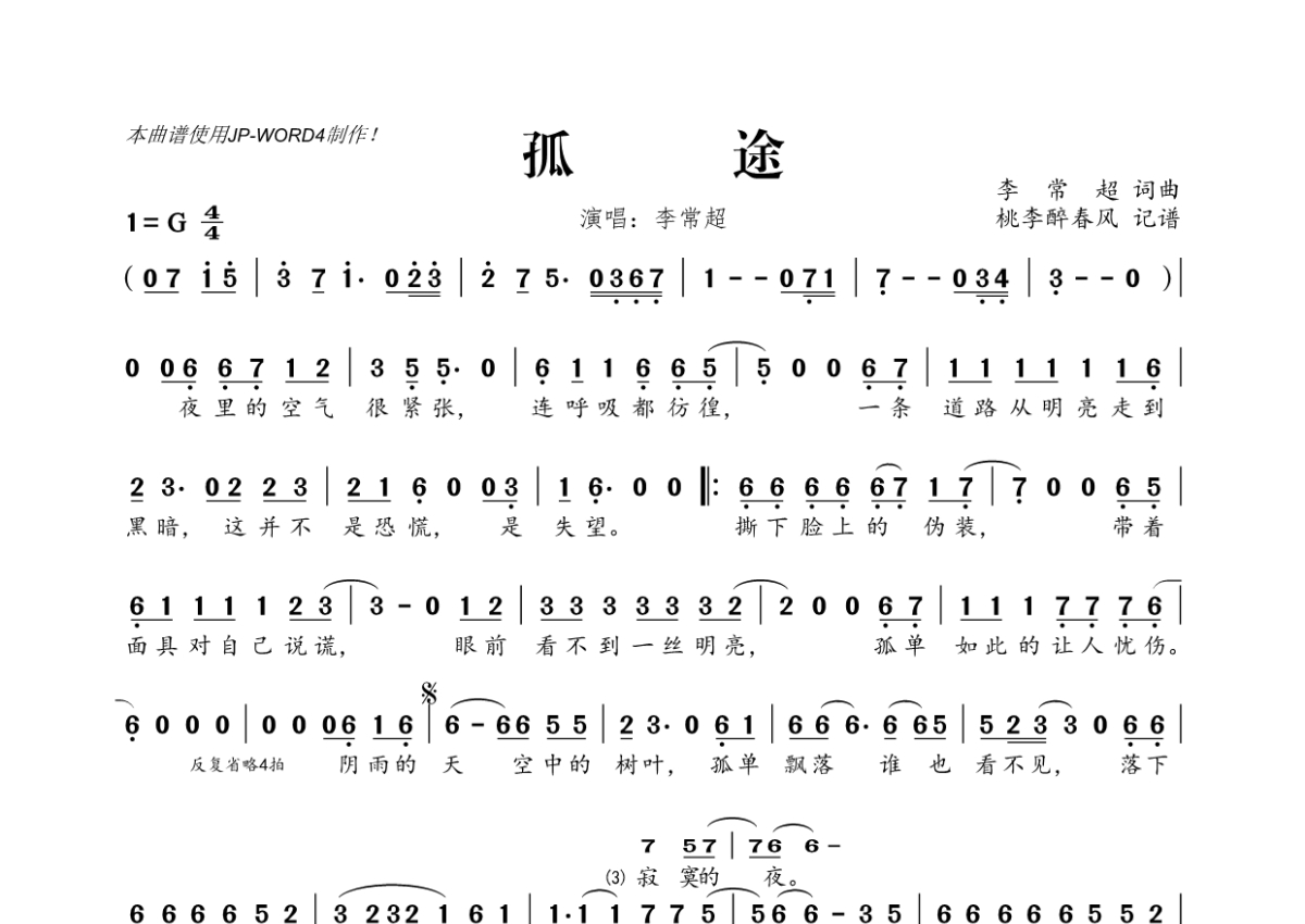 《孤途》是李常超演唱的一首歌曲,拍号为4/4拍,这份简谱共有一张高清图谱,图谱由 @桃李醉春风 编配上传。