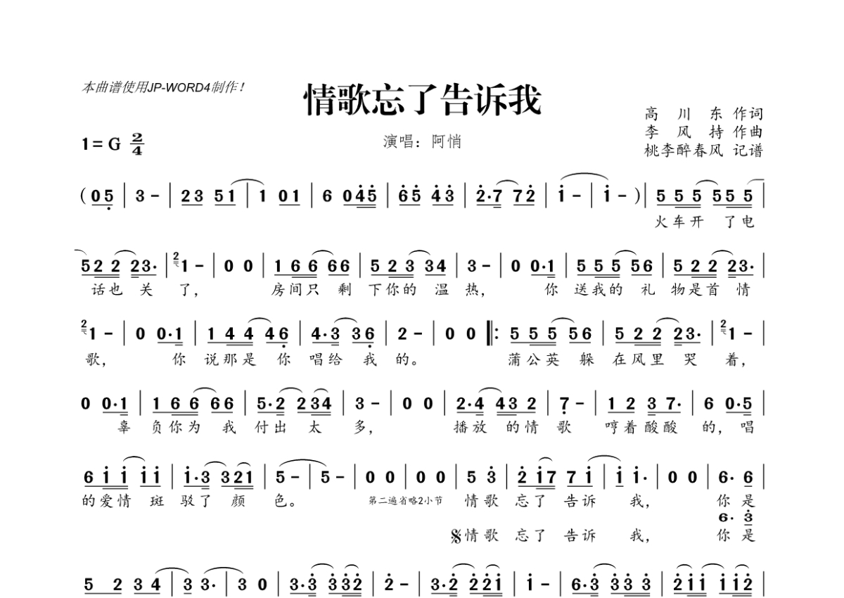 《情歌忘了告诉我》是阿悄演唱的一首歌曲,拍号为2/4拍,这份简谱共有一张高清图谱,图谱由 @桃李醉春风 编配上传。