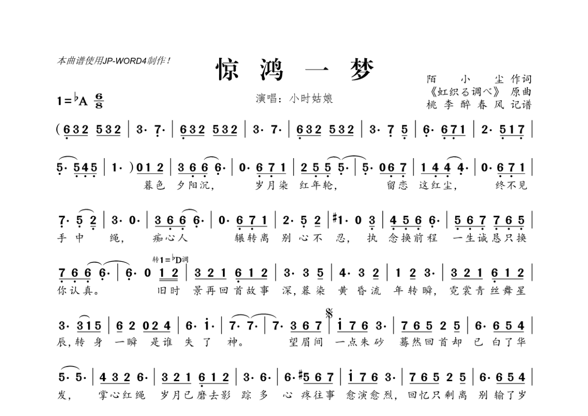 《惊鸿一梦》是小时姑娘演唱的一首歌曲,拍号为6/8拍,这份简谱共有一张高清图谱,图谱由 @桃李醉春风 编配上传。