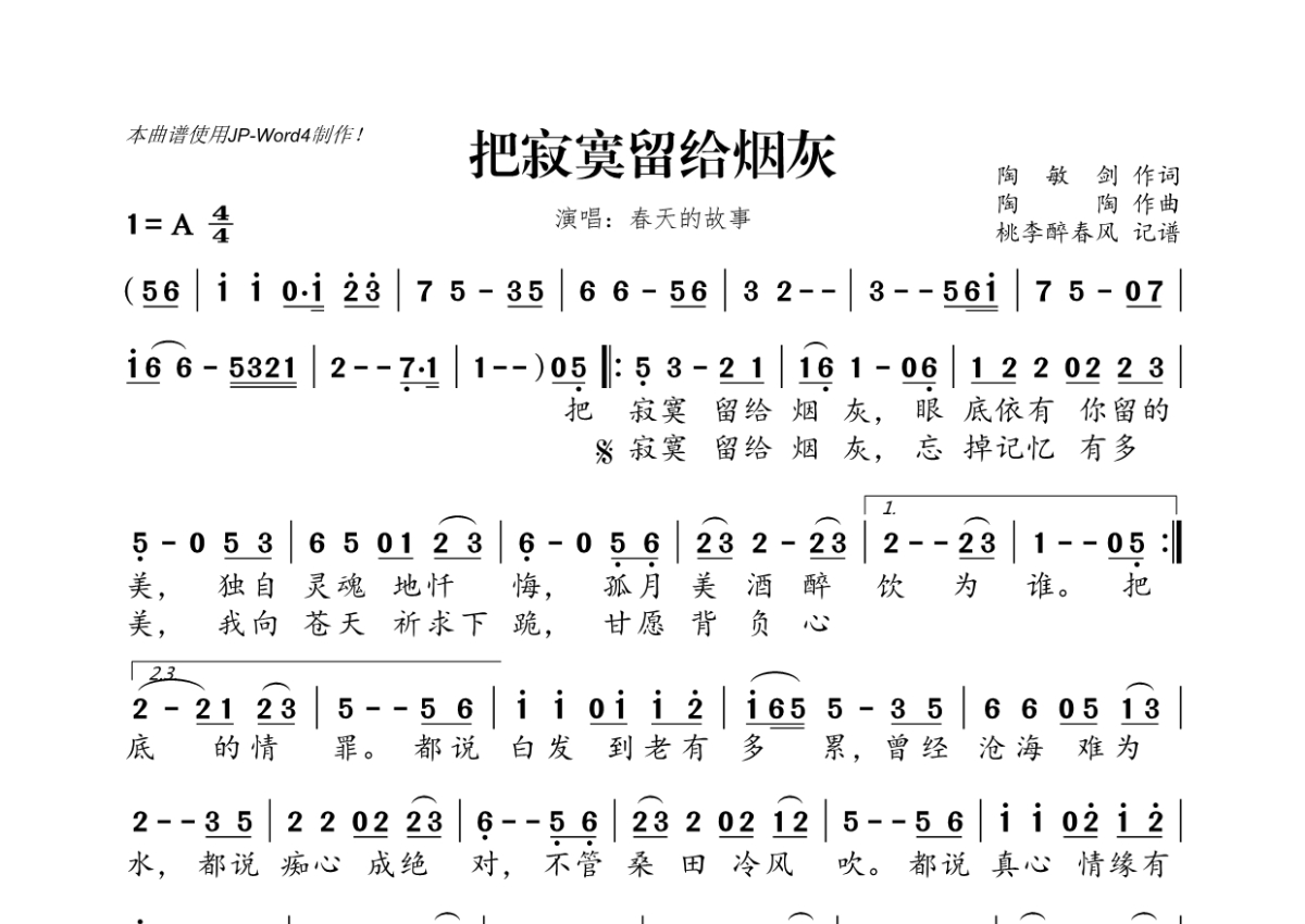 《把寂寞留给烟灰》是春天的故事演唱的一首歌曲,拍号为4/4拍,这份简谱共有一张高清图谱,图谱由 @桃李醉春风 编配上传。