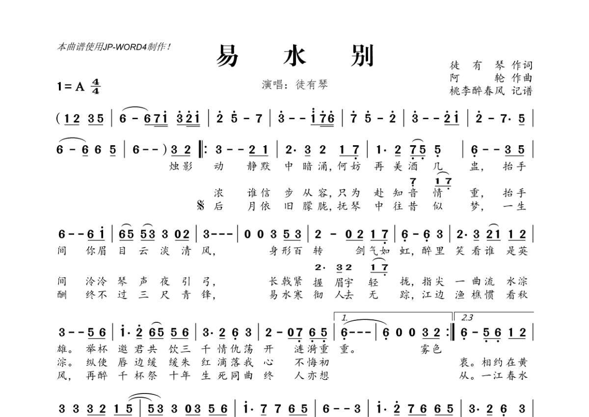 《易水别》是徒有琴演唱的一首歌曲,拍号为4/4拍,这份简谱共有一张高清图谱,图谱由 @桃李醉春风 编配上传。