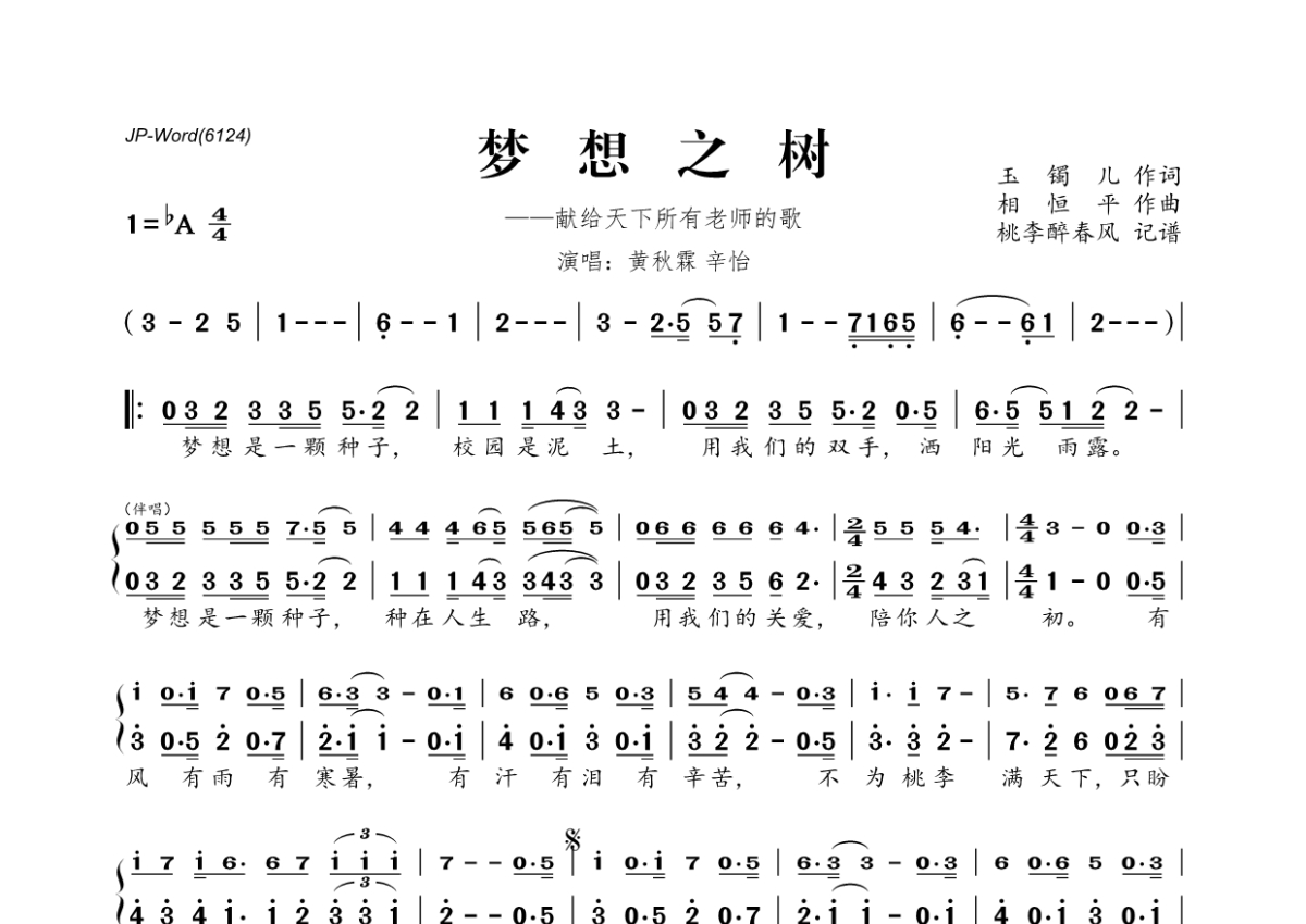 梦想之树简谱 - 黄秋霖&辛怡演唱