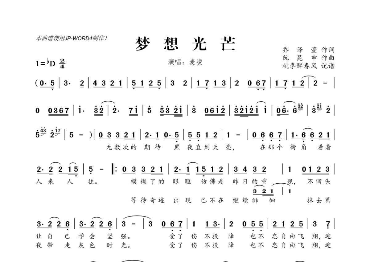 《梦想光芒》是麦凌演唱的一首歌曲,拍号为2/4拍,这份简谱共有两张高清图谱,图谱由 @桃李醉春风 编配上传。