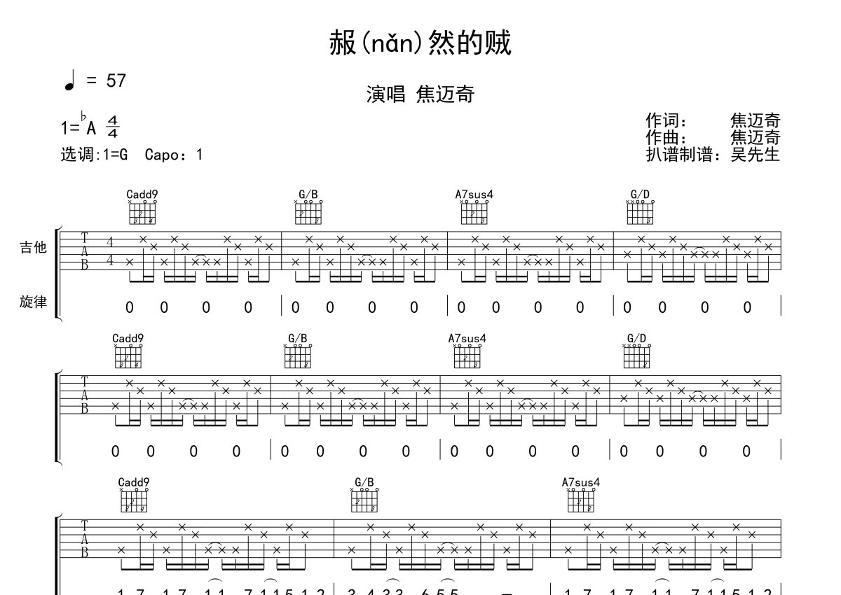 《赧然的贼》是焦迈奇演唱的一首歌曲,本吉他谱采用的是G调指法编配,这份吉他谱共有两张高清图谱,图谱由 @吴先生TAB 编配上传,图谱使用六线谱编配,包含吉他和弦指法、简谱以及歌词部分,使用这份赧然的贼吉他谱,可以让你更加方便地掌握这首歌曲的弹唱技巧,快来尝试吧。焦迈奇《赧然的贼》吉他谱_G调吉他弹唱谱。