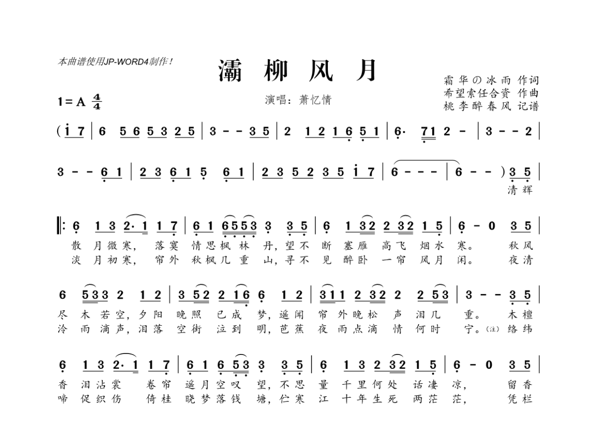 《灞柳风月》是萧忆情Alex演唱的一首歌曲,拍号为4/4拍,这份简谱共有两张高清图谱,图谱由 @桃李醉春风 编配上传。