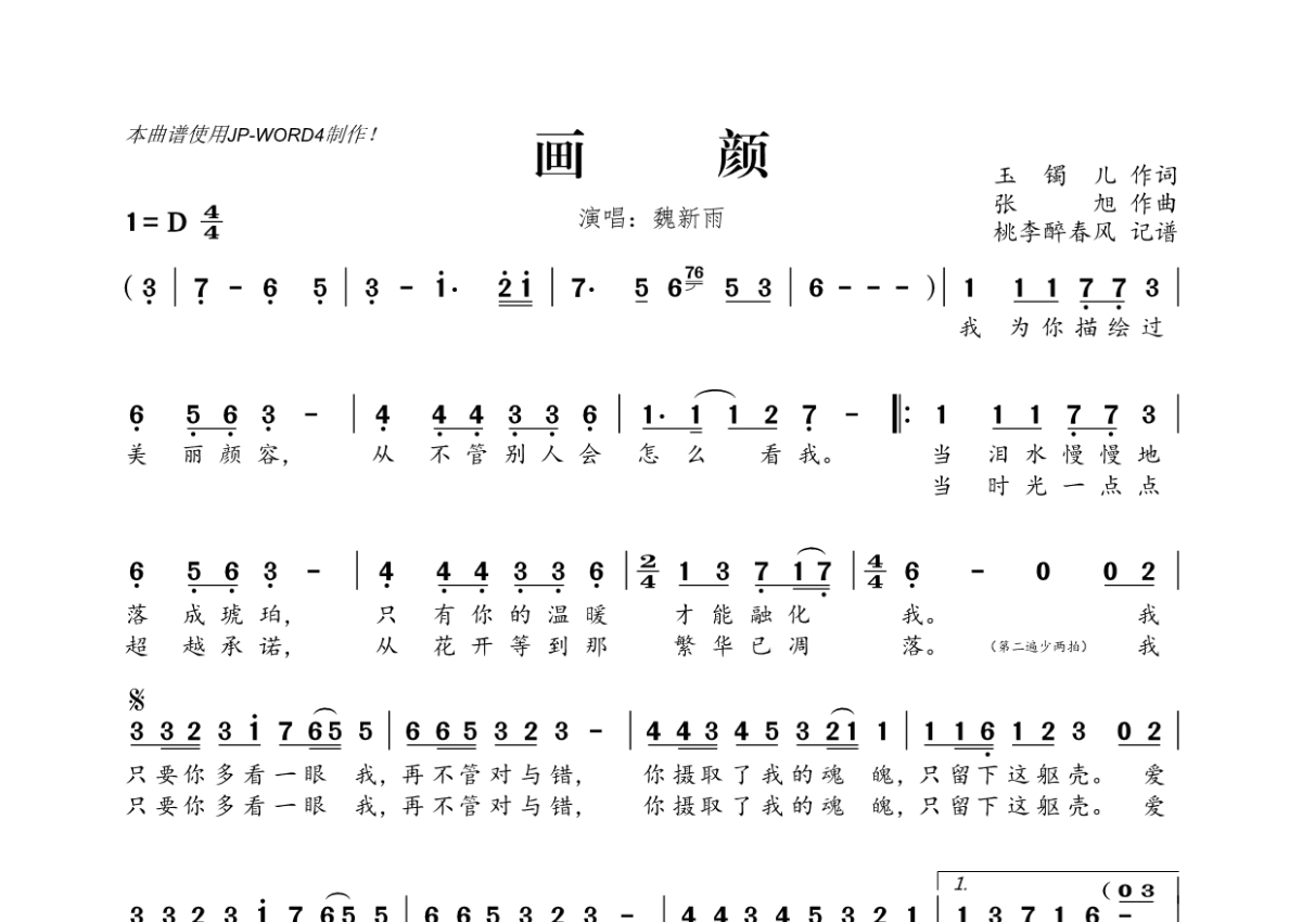 《画颜》是魏新雨演唱的一首歌曲,拍号为4/4拍,这份简谱共有一张高清图谱,图谱由 @桃李醉春风 编配上传。