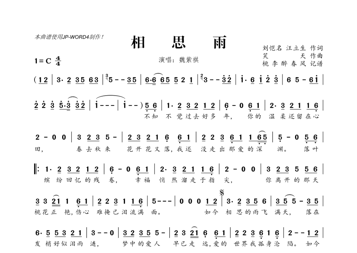 《相思雨》是魏紫祺演唱的一首歌曲,拍号为4/4拍,这份简谱共有一张高清图谱,图谱由 @桃李醉春风 编配上传。