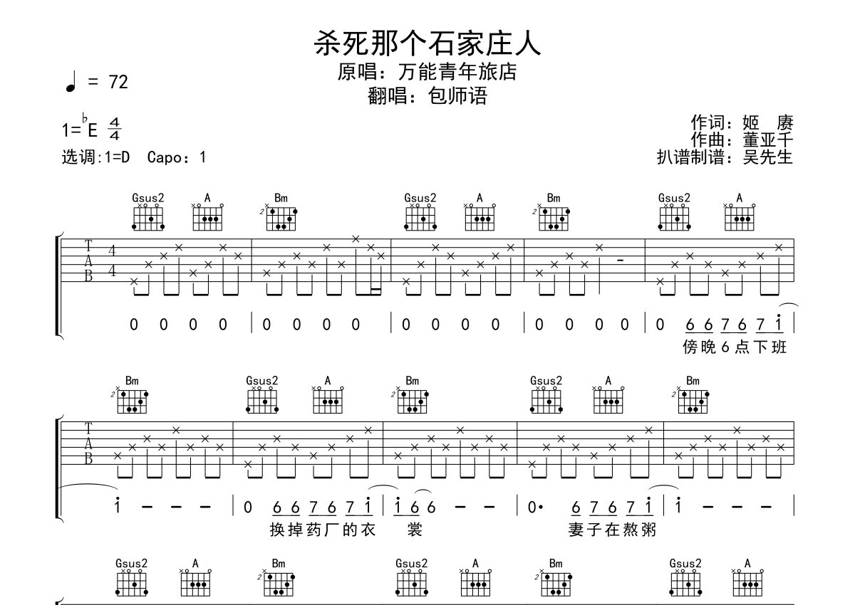 《杀死那个石家庄人》是万能青年旅店演唱的一首歌曲,本吉他谱采用的是D调指法编配,这份吉他谱共有两张高清图谱,图谱由 @吴先生TAB 编配上传,图谱使用六线谱编配,包含吉他和弦指法、简谱以及歌词部分,使用这份杀死那个石家庄人吉他谱,可以让你更加方便地掌握这首歌曲的弹唱技巧,快来尝试吧。《杀死那个石家庄人》,万能青年旅店创作并于2010年演唱的歌曲,收录在专辑《万能青年旅店》中。这首歌实际上描述了北方重工业城市在经历过了时代变迁,从计划经济到市场经济的的变轨所经历的阵痛,和那些被遗忘或者是被抛弃的群体的失落和愤怒的感受。资源丰富和经济繁荣的城市已经荣光不再,而沿海的贸易投机者们取代了踏实的劳动者成为了时代的新宠儿。杀死那个石家庄人吉他谱由吴先生TAB制谱,万能青年旅店的版本是是D调。包师语的版本是降E调。选D调指法,变调夹夹1品回原调。本谱有按照自己的想法做了些改动。主要表现在主歌部分全部用分解节奏,副歌部分才用扫弦。生于理想,死于欲望。如果你累了,那就换一种生活方式吧。