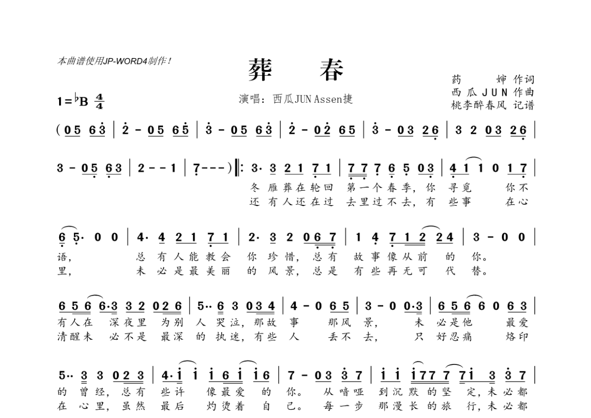 《葬春》是西瓜JUN&Assen捷演唱的一首歌曲,拍号为4/4拍,这份简谱共有一张高清图谱,图谱由 @桃李醉春风 编配上传。
