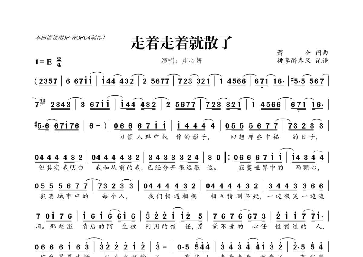 《走着走着就散了》是庄心妍演唱的一首歌曲,拍号为2/4拍,这份简谱共有一张高清图谱,图谱由 @桃李醉春风 编配上传。