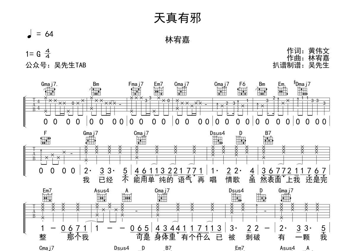《天真有邪》是林宥嘉演唱的一首歌曲,本吉他谱采用的是G调指法编配,这份吉他谱共有两张高清图谱,图谱由 @吴先生TAB 编配上传,图谱使用六线谱编配,包含吉他和弦指法、简谱以及歌词部分,使用这份天真有邪吉他谱,可以让你更加方便地掌握这首歌曲的弹唱技巧,快来尝试吧。《天真有邪》是林宥嘉演唱的歌曲,由黄伟文填词、林宥嘉谱曲,收录于林宥嘉2016年6月17日发行的专辑《今日营业中》中。《天真有邪》中,黄伟文用一针见血的歌词描述了人们经历过爱情的伤痛后,从一个天真无邪的人成长为有邪、有故事的大人的过程。林宥嘉用迷幻的嗓音去诠释这首歌曲,展现了爱情绚烂而悲伤的一面,激起听众的回忆,在刺痛听众心脏的同时也抚慰着听众的心。在编曲上,《天真有邪》运用了钢琴的配乐,整首歌曲层次分明。