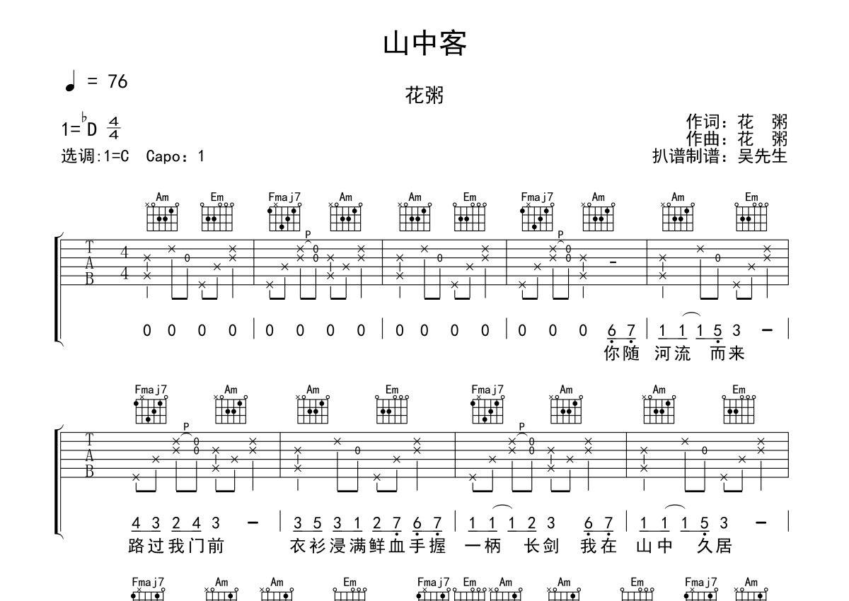 《山中客》是花粥演唱的一首歌曲,本吉他谱采用的是C调指法编配,这份吉他谱共有两张高清图谱,图谱由 @吴先生TAB 编配上传,图谱使用六线谱编配,包含吉他和弦指法、简谱以及歌词部分,使用这份山中客吉他谱,可以让你更加方便地掌握这首歌曲的弹唱技巧,快来尝试吧。 你随河流而来 路过我门前 衣衫浸满鲜血 手握一柄长剑 我在山中久居 少遇见人烟 走兽飞禽不缺 不羡鸳鸯不羡仙 我未曾问你何时离 你不曾许我有归期 彼时一别若几千里 此生难再相逢并肩立 。