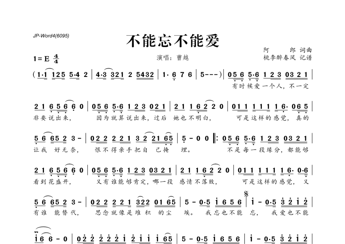 《不能忘不能爱》是曹越演唱的一首歌曲,拍号为4/4拍,这份简谱共有一张高清图谱,图谱由 @桃李醉春风 编配上传。