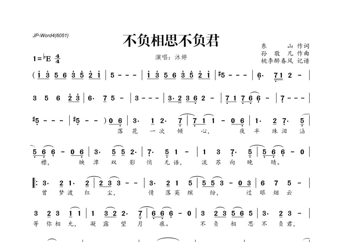 《不负相思不负君》是沐婷演唱的一首歌曲,拍号为4/4拍,这份简谱共有一张高清图谱,图谱由 @桃李醉春风 编配上传。