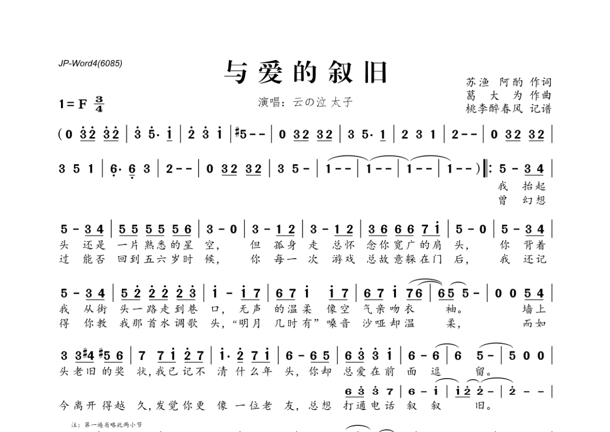 《与爱的叙旧》是云之泣&CANT太子演唱的一首歌曲,拍号为3/4拍,这份简谱共有一张高清图谱,图谱由 @桃李醉春风 编配上传。