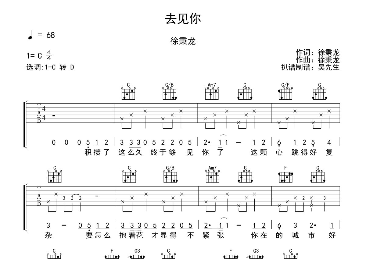 《去见你》是徐秉龙演唱的一首歌曲,本吉他谱采用的是C调指法编配,这份吉他谱共有两张高清图谱,图谱由 @吴先生TAB 编配上传,图谱使用六线谱编配,包含吉他和弦指法、简谱以及歌词部分,使用这份去见你吉他谱,可以让你更加方便地掌握这首歌曲的弹唱技巧,快来尝试吧。徐秉龙,2000年出生于浙江省台州市,中国内地流行乐男歌手。徐秉龙从小喜爱古典诗词,徐秉龙从7、8岁开始抄词。2014年,14岁的他在电视上听到歌曲《卷珠帘》后,便深深爱上了这首中国风原创歌曲;于是,原创音乐开始走进他的生活。一开始,徐秉龙对音乐知识一窍不通,他不懂音律,也从没接触过乐理,更没有学过任何乐器,在原创音乐的世界里他勇敢尝试,自学写歌。2016年,发布个人第一首原创歌曲《我们》,从而正式进入演艺圈;同年,他还推出了《梧桐》、《还记得》等原创单曲。2017年,其演唱的歌曲《鸽子》正式上线;同年,推出个人单曲《白羊》。2018年,推出首张个人原创EP《零零》。2019年,获得“硬地围炉夜·2018年度网易云音乐原创盛典”年度最受欢迎男音乐人奖;3月15日,获得LPA独立音乐盛典流行类最佳现场奖。煮草文化旗下音乐人徐秉龙全新单曲《去见你》温暖上线。继《宝贝》之后发布的又一创作单曲。这首《去见你》依旧是徐秉龙包揽词曲创作,讲述的是歌者与听众之间微妙的特殊关系,歌曲一经曝光便引起歌迷的讨论。整首歌行进犹如浪漫情景剧,清新美好,层次分明。看着像是以一位歌迷的口吻揭开序幕,但其实通篇更像是对朋友间的对话。歌曲结尾又回到首段,秉龙一如恋人絮语般的语气,感觉像是“我们”经历的一幕幕生命转场。再见又分开,分开是为了下一次更好的再见。在创作这首歌的时候,徐秉龙正在举行全国巡演,歌迷朋友从全国各地过来看他的演出,便萌生出了想送一首歌送给一直支持自己的歌迷朋友的想法。歌曲录制过程中,演唱情绪的拿捏,制作过程中一遍遍的打磨细节,歌词斟字酌句的释放内心情感,可见其用心程度。尤其歌词那一句[我们去找一个没有人的夜吧有蜡烛有草莓有吉他我会给你写首柔软的情歌啊用你喜欢的语法]。仿佛唱出了歌者与歌迷之间的微妙关系,如恋人如朋友,彼此影响,一起成长。在《去见你》歌曲中除了以歌迷视角表达感情,也听见了真诚的表演者如徐秉龙最内心的告白。