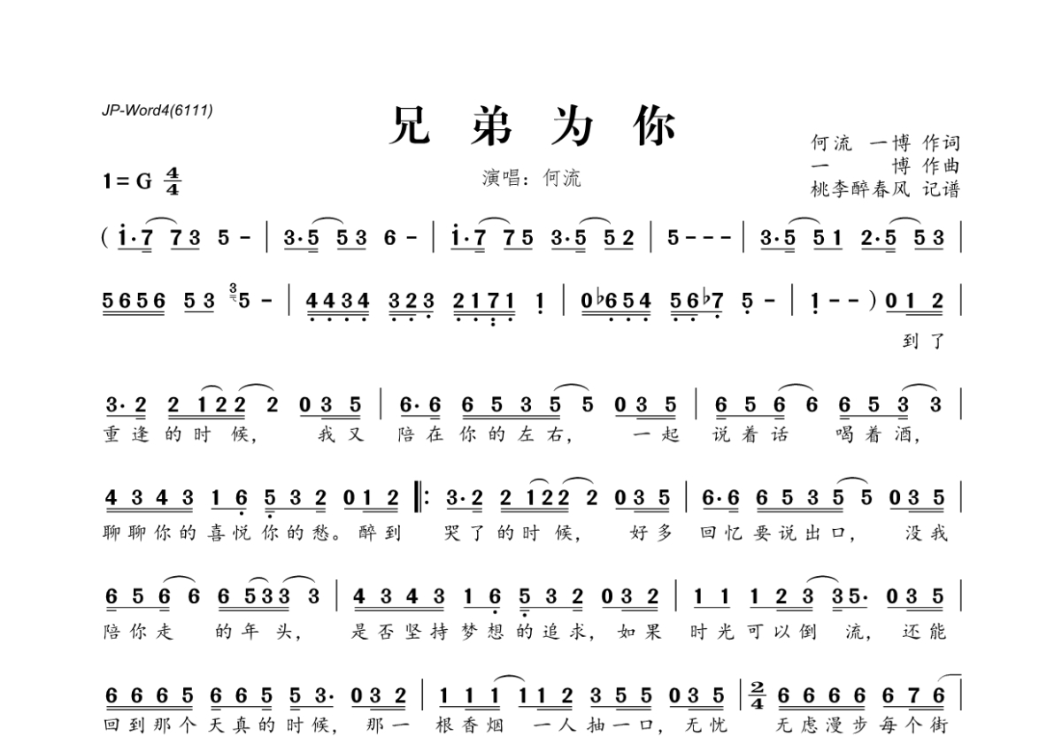 何流《兄弟为你》简谱