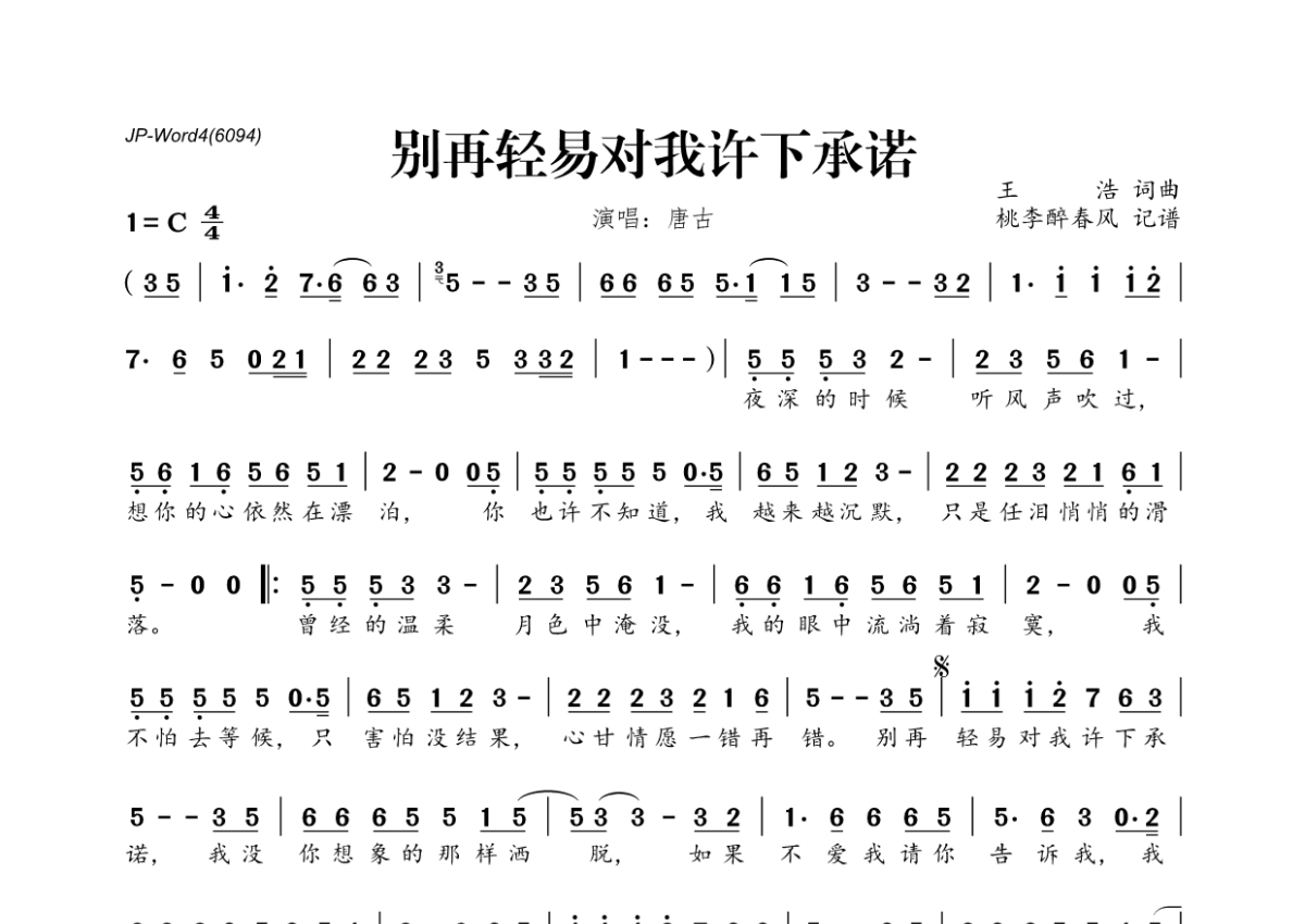 《别再轻易对我许下承诺》是唐古演唱的一首歌曲,拍号为4/4拍,这份简谱共有一张高清图谱,图谱由 @桃李醉春风 编配上传。