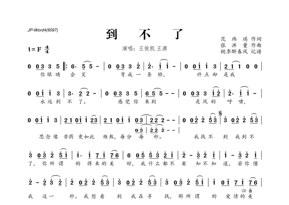 《到不了》是王俊凯&王源演唱的一首歌曲,拍号为4/4拍,这份简谱共有一张高清图谱,图谱由 @桃李醉春风 编配上传。