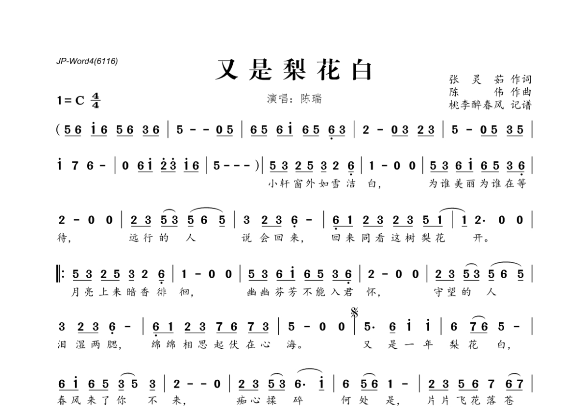 陈瑞《又是梨花白》简谱