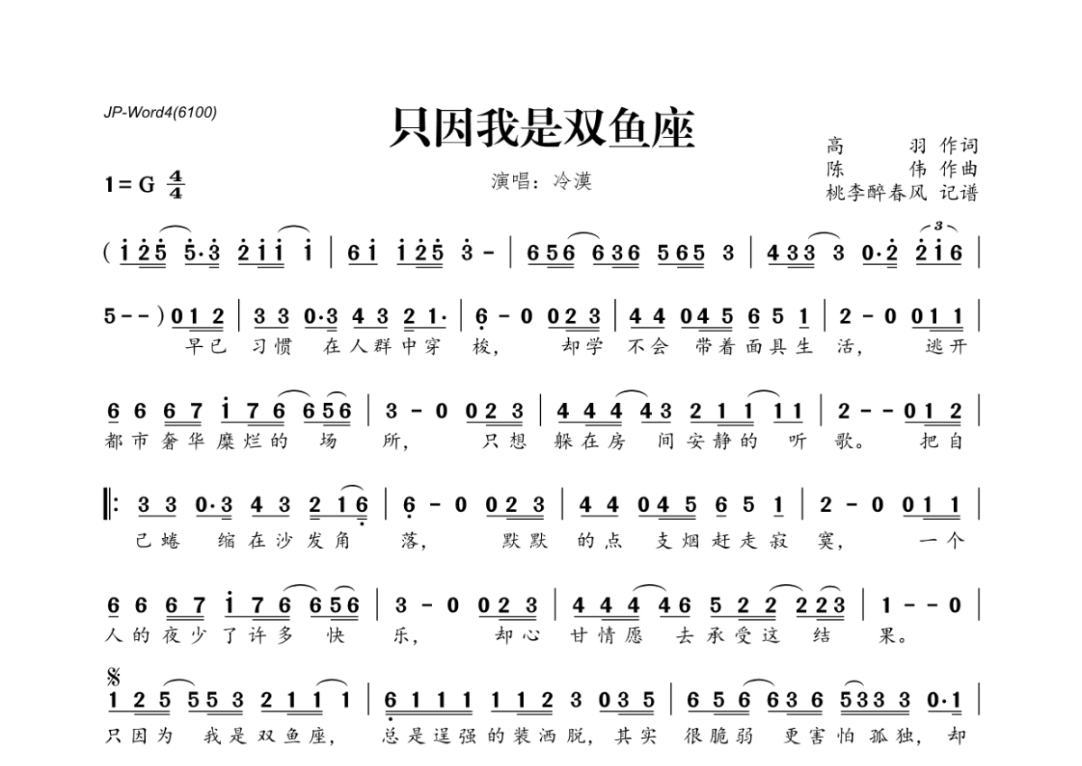 《只因我是双鱼座》是冷漠演唱的一首歌曲,拍号为4/4拍,这份简谱共有一张高清图谱,图谱由 @桃李醉春风 编配上传。