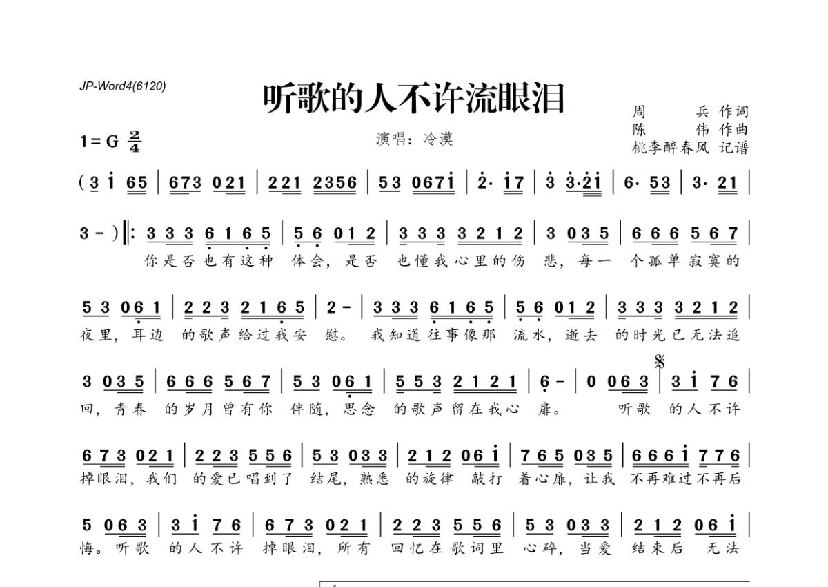 《听歌的人不许流眼泪》是冷漠演唱的一首歌曲,拍号为2/4拍,这份简谱共有一张高清图谱,图谱由 @桃李醉春风 编配上传。