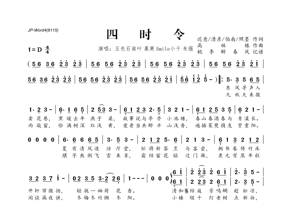 《四时令》是五色石南叶&慕寒&Smile_小千&朱强演唱的一首歌曲,拍号为4/4拍,这份简谱共有一张高清图谱,图谱由 @桃李醉春风 编配上传。