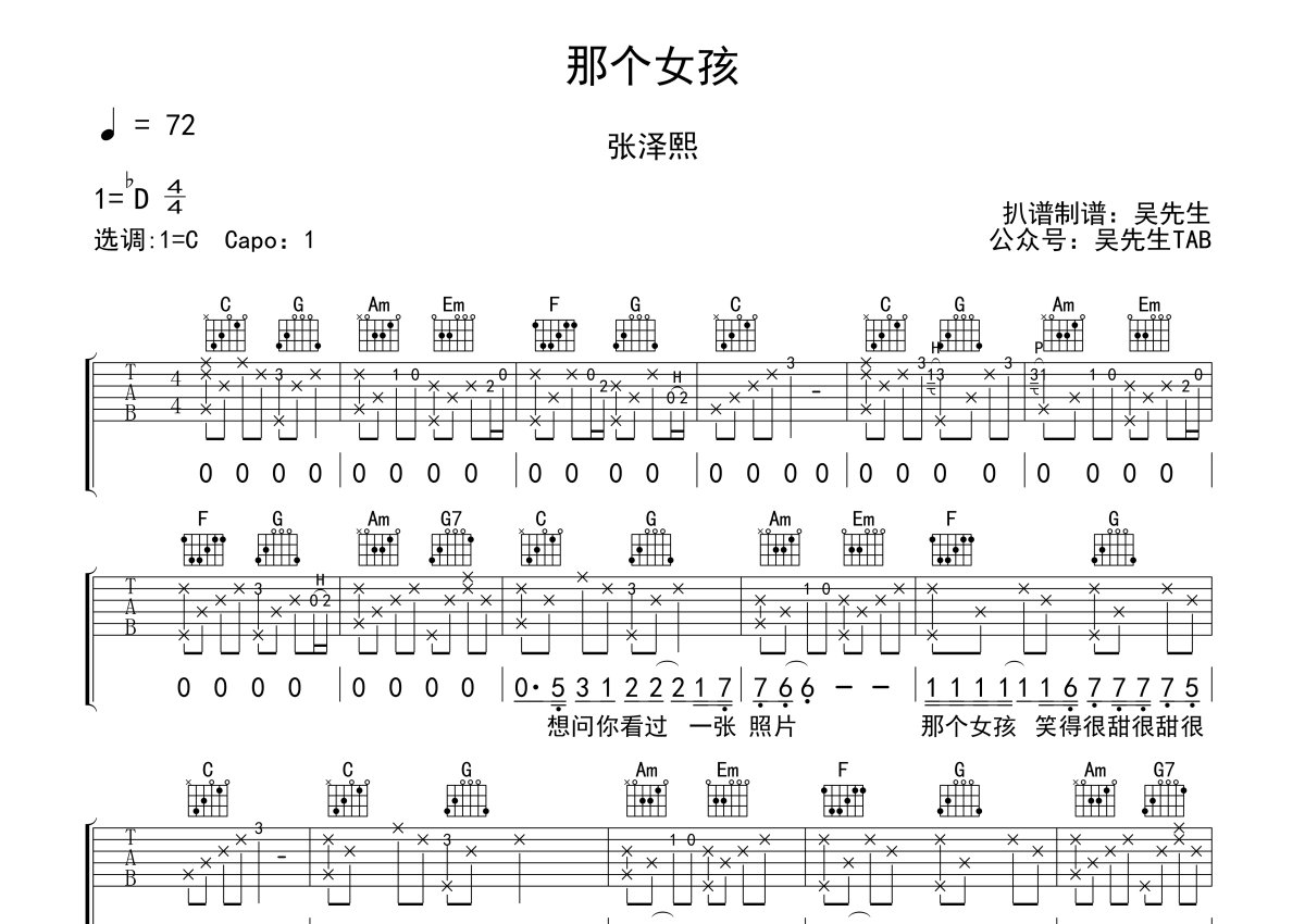 张泽熙《那个女孩》吉他谱 - C调弹唱六线谱