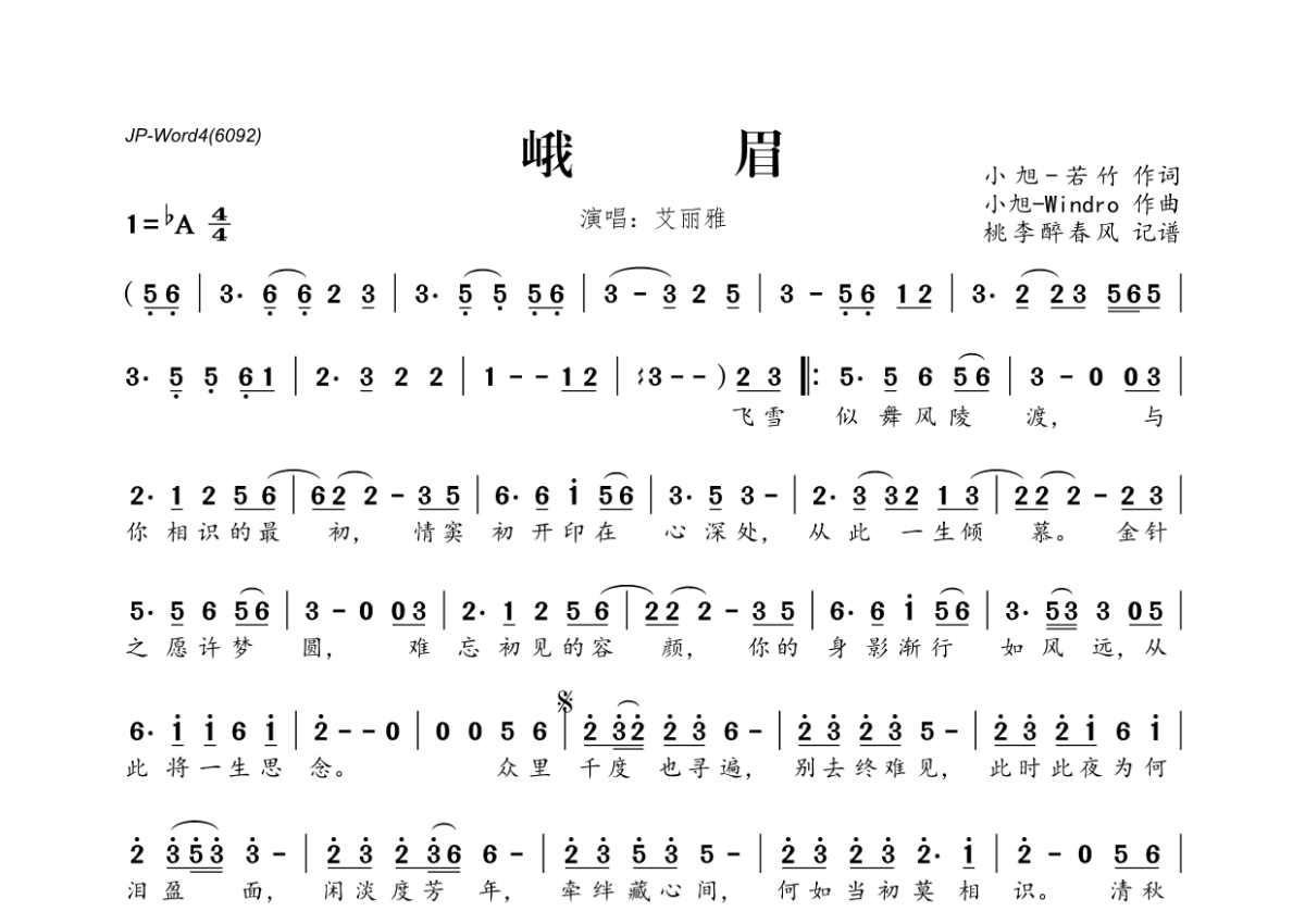 《峨眉》是艾丽雅演唱的一首歌曲,拍号为4/4拍,这份简谱共有一张高清图谱,图谱由 @桃李醉春风 编配上传。