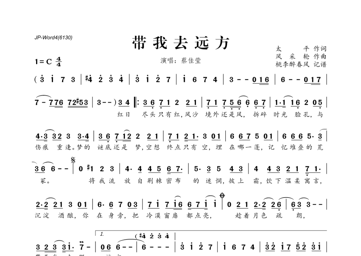 《带我去远方》是蔡佳莹演唱的一首歌曲,拍号为4/4拍,这份简谱共有一张高清图谱,图谱由 @桃李醉春风 编配上传。