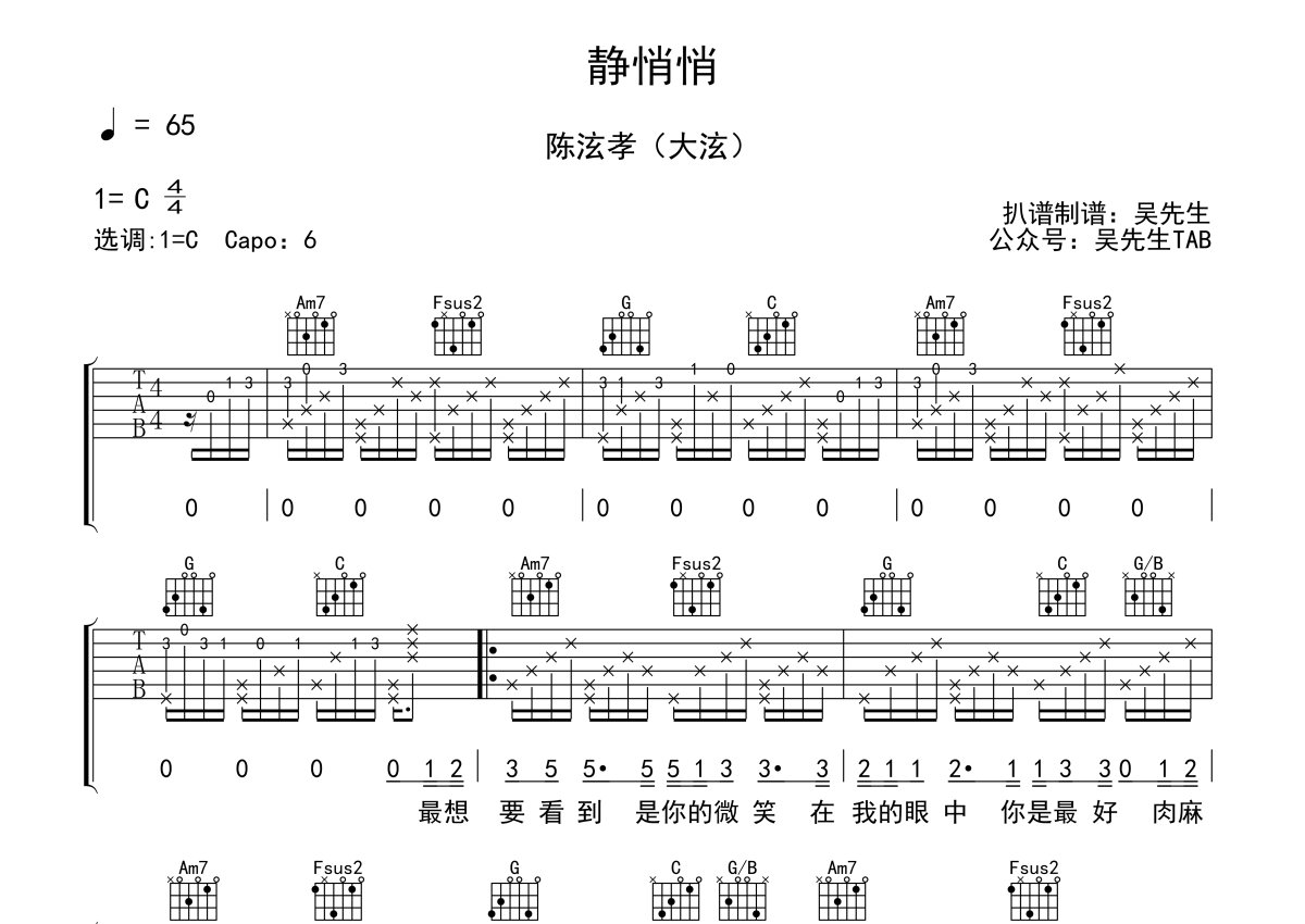 《静悄悄》是大泫演唱的一首歌曲,本吉他谱采用的是C调指法编配,这份吉他谱共有两张高清图谱,图谱由 @吴先生TAB 编配上传,图谱使用六线谱编配,包含吉他和弦指法、简谱以及歌词部分,使用这份静悄悄吉他谱,可以让你更加方便地掌握这首歌曲的弹唱技巧,快来尝试吧。《静悄悄》是伍华填词作曲,大泫演唱的歌曲,发行时间是2018年3月27日。大泫,中国内地男歌手,出生于广东省汕尾市,是MISTAR公司旗下的艺人。偶像选秀综艺这把大火一点燃简直停不下来!最近,《青春有你》和《以团之名》更是双双放出花絮,上百个好看又有才的小哥哥即将上线,追星女孩的2019感觉已经被安排得明明白白~凭借《静悄悄》爆红的新生代歌手大泫也被网友喊话去当练习生!热单《静悄悄》上线酷狗后,迅速赢得了超过1.5万的好评,网友欣赏大泫的唱功,也沦陷于大泫的颜值,更有评论直接呼吁:“这实力去《青春有你》一定会火啊!”简直说出不少网友的心声~ 。
