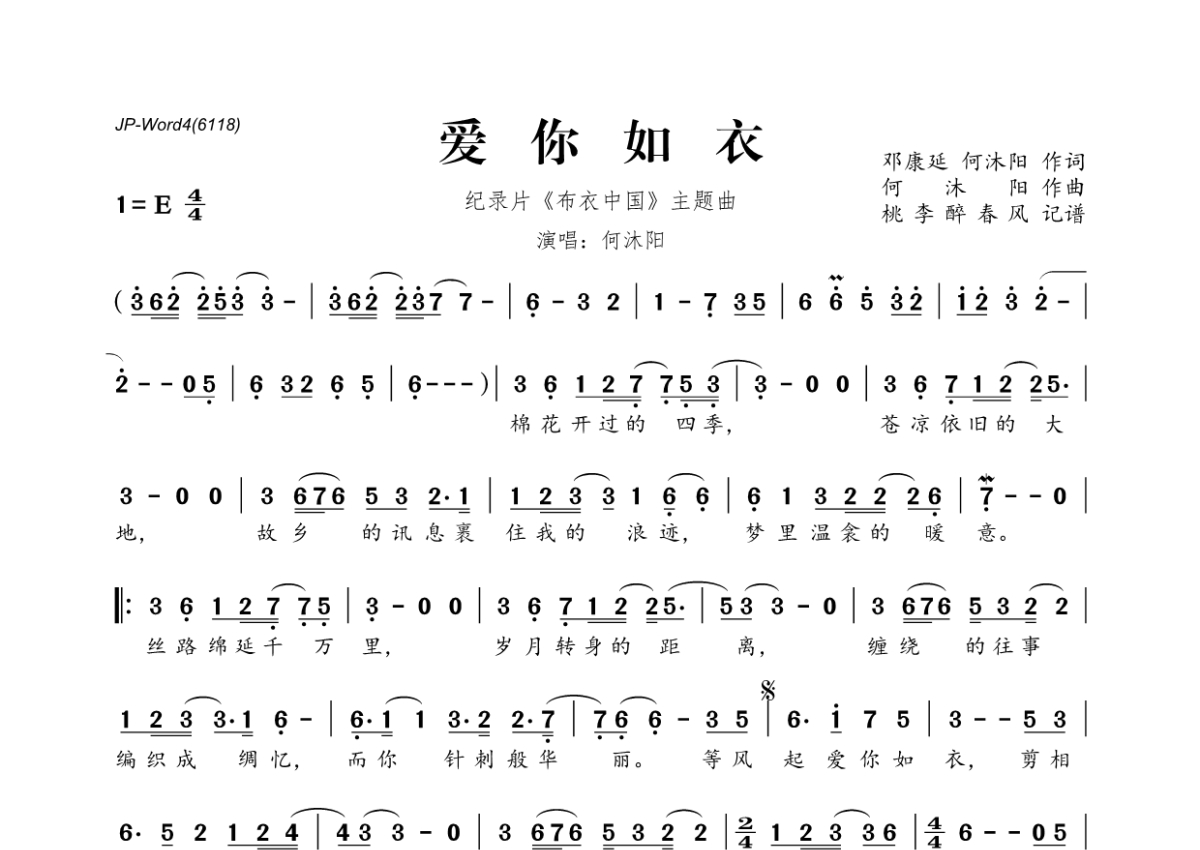 《爱你如衣》是何沐阳演唱的一首歌曲,拍号为4/4拍,这份简谱共有一张高清图谱,图谱由 @桃李醉春风 编配上传。