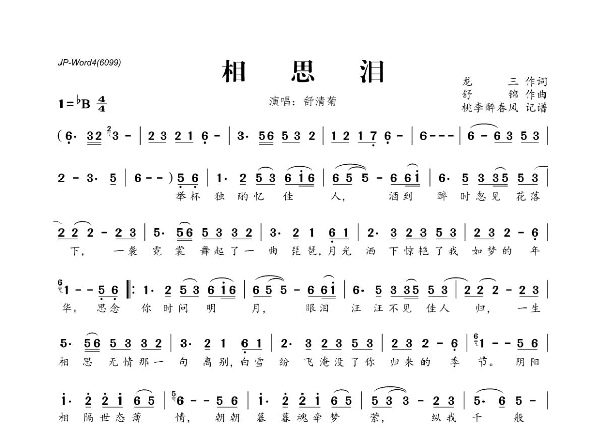 《相思泪》是舒清菊演唱的一首歌曲,拍号为4/4拍,这份简谱共有一张高清图谱,图谱由 @桃李醉春风 编配上传。