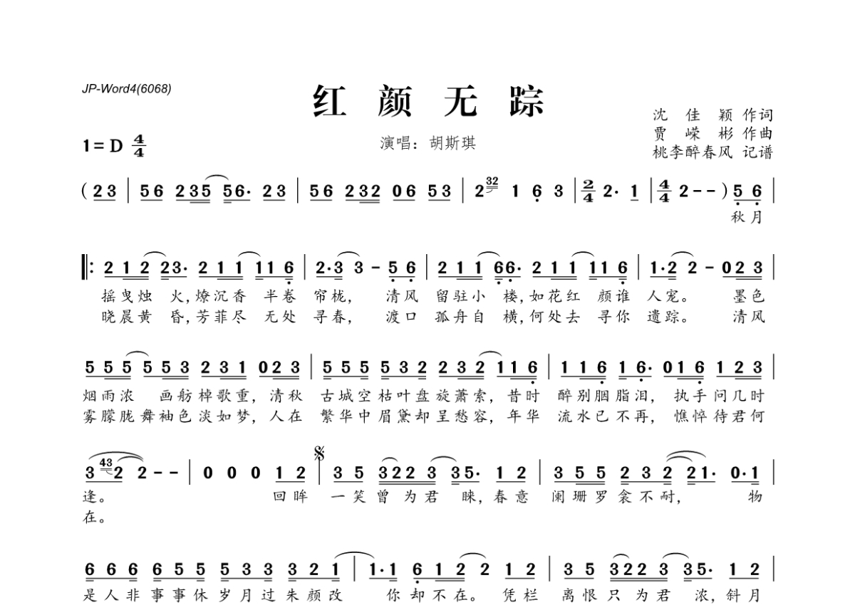 《红颜无踪》是胡斯琪演唱的一首歌曲,拍号为4/4拍,这份简谱共有一张高清图谱,图谱由 @桃李醉春风 编配上传。