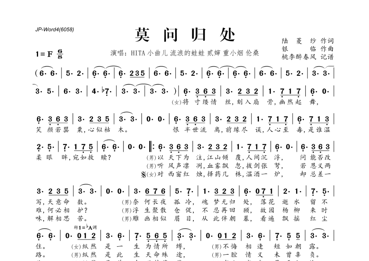 《莫问归处》是HITA演唱的一首歌曲,拍号为6/8拍,这份简谱共有一张高清图谱,图谱由 @桃李醉春风 编配上传。
