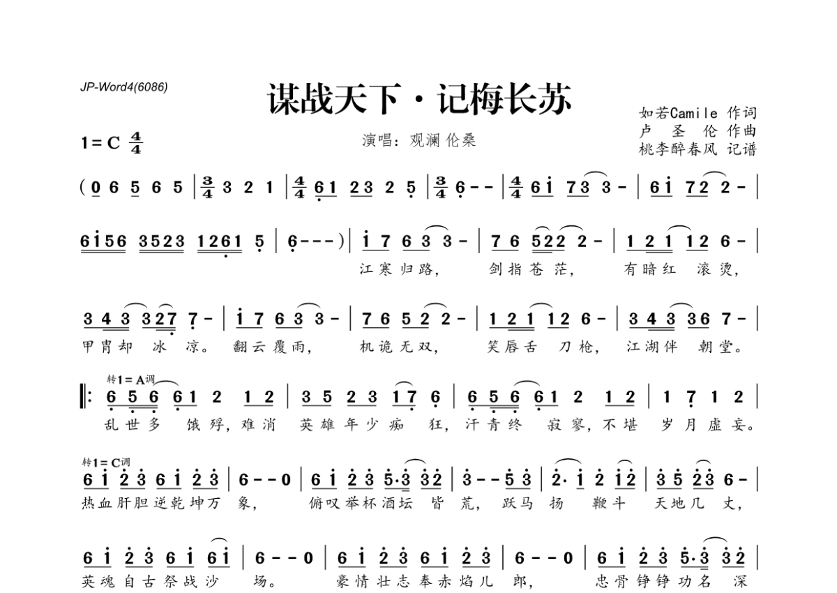 《谋战天下•记梅长苏》是伦桑&观澜演唱的一首歌曲,拍号为4/4拍,这份简谱共有一张高清图谱,图谱由 @桃李醉春风 编配上传。