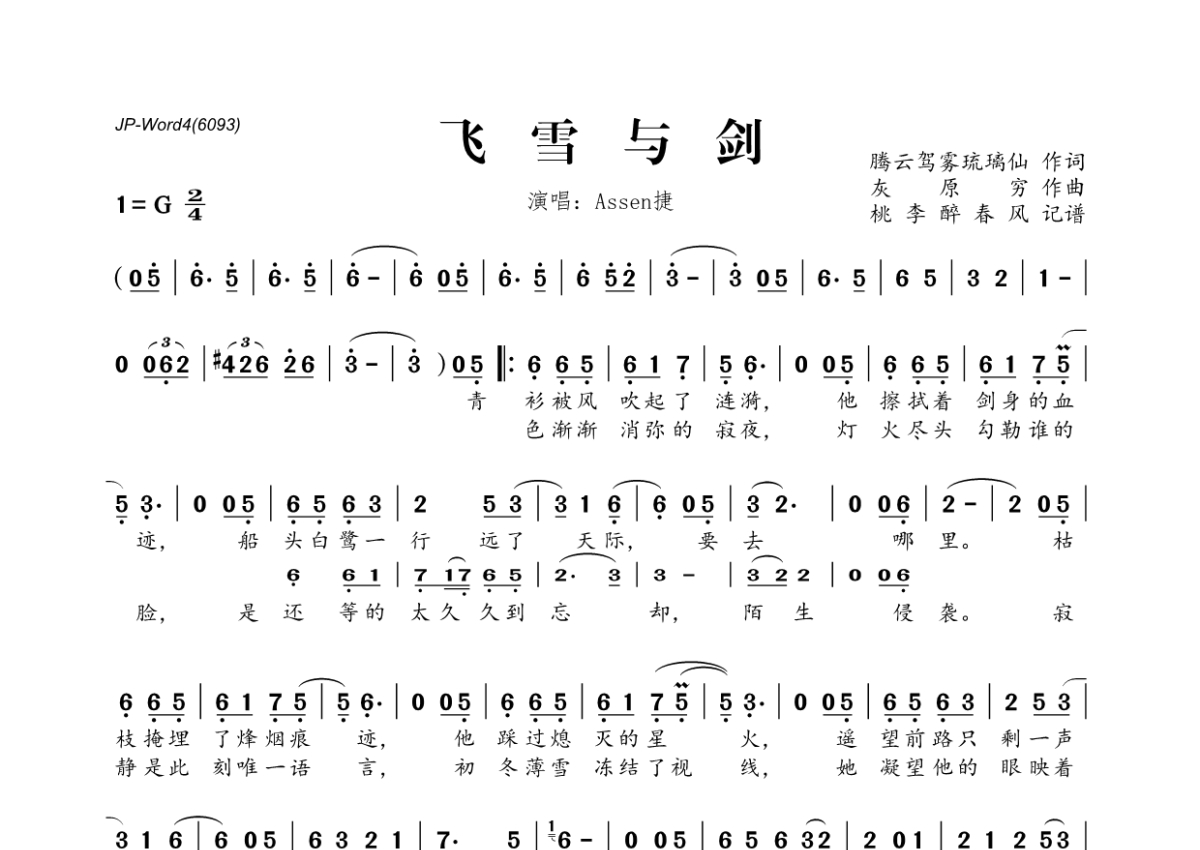 《飞雪与剑》是Assen捷演唱的一首歌曲,拍号为2/4拍,这份简谱共有两张高清图谱,图谱由 @桃李醉春风 编配上传。
