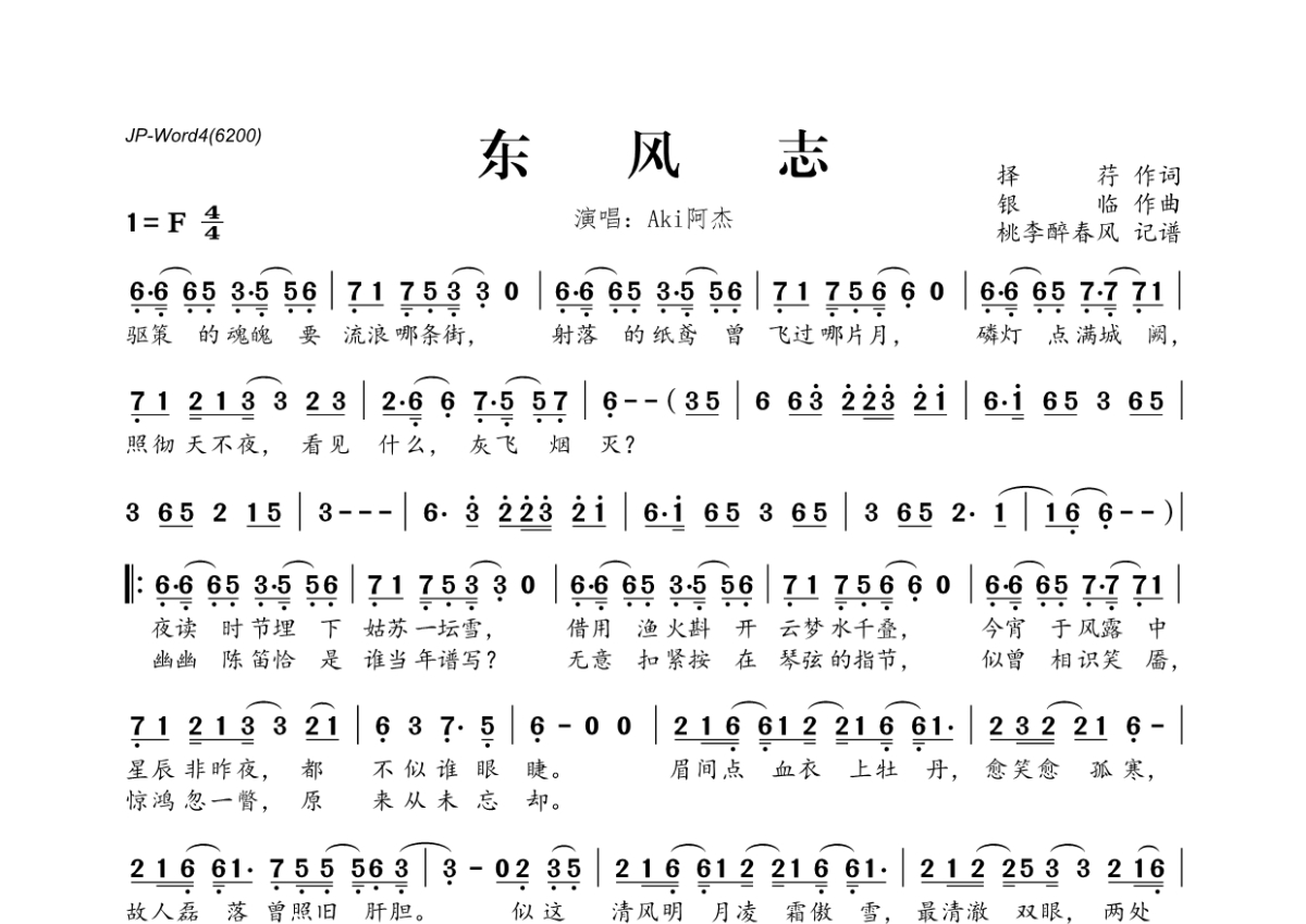 《东风志》是Aki阿杰演唱的一首歌曲,拍号为4/4拍,这份简谱共有一张高清图谱,图谱由 @桃李醉春风 编配上传。