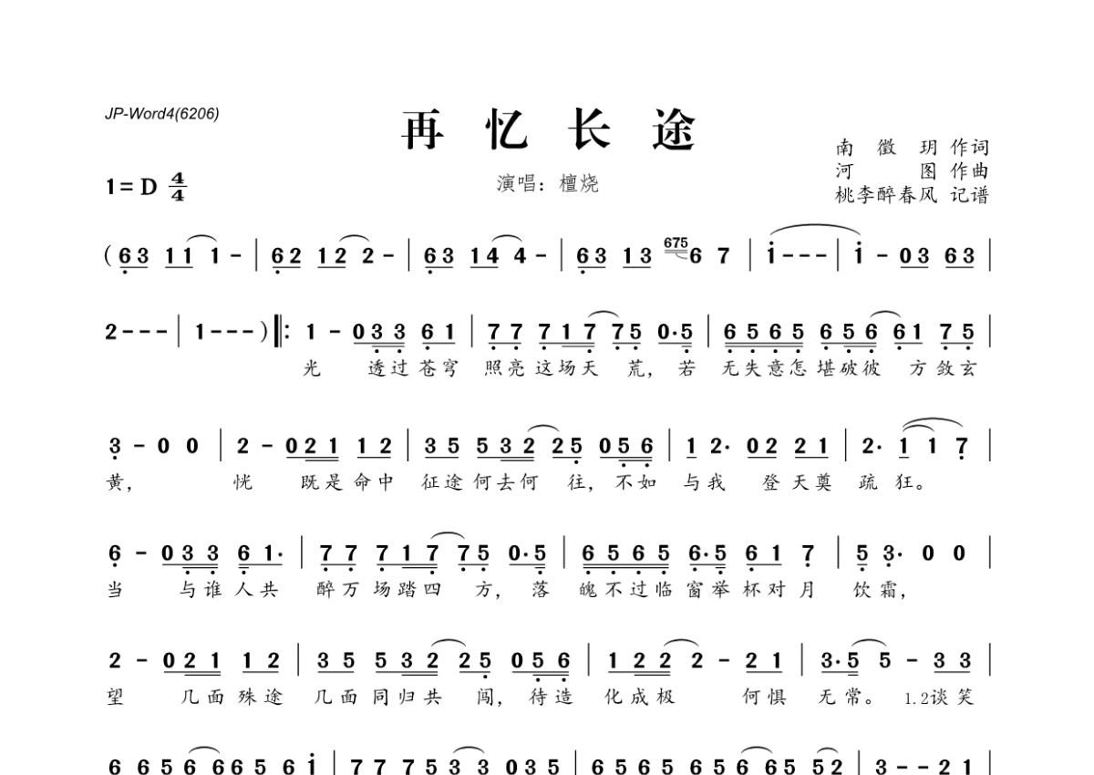 《再忆长途》是檀烧演唱的一首歌曲,拍号为4/4拍,这份简谱共有一张高清图谱,图谱由 @桃李醉春风 编配上传。